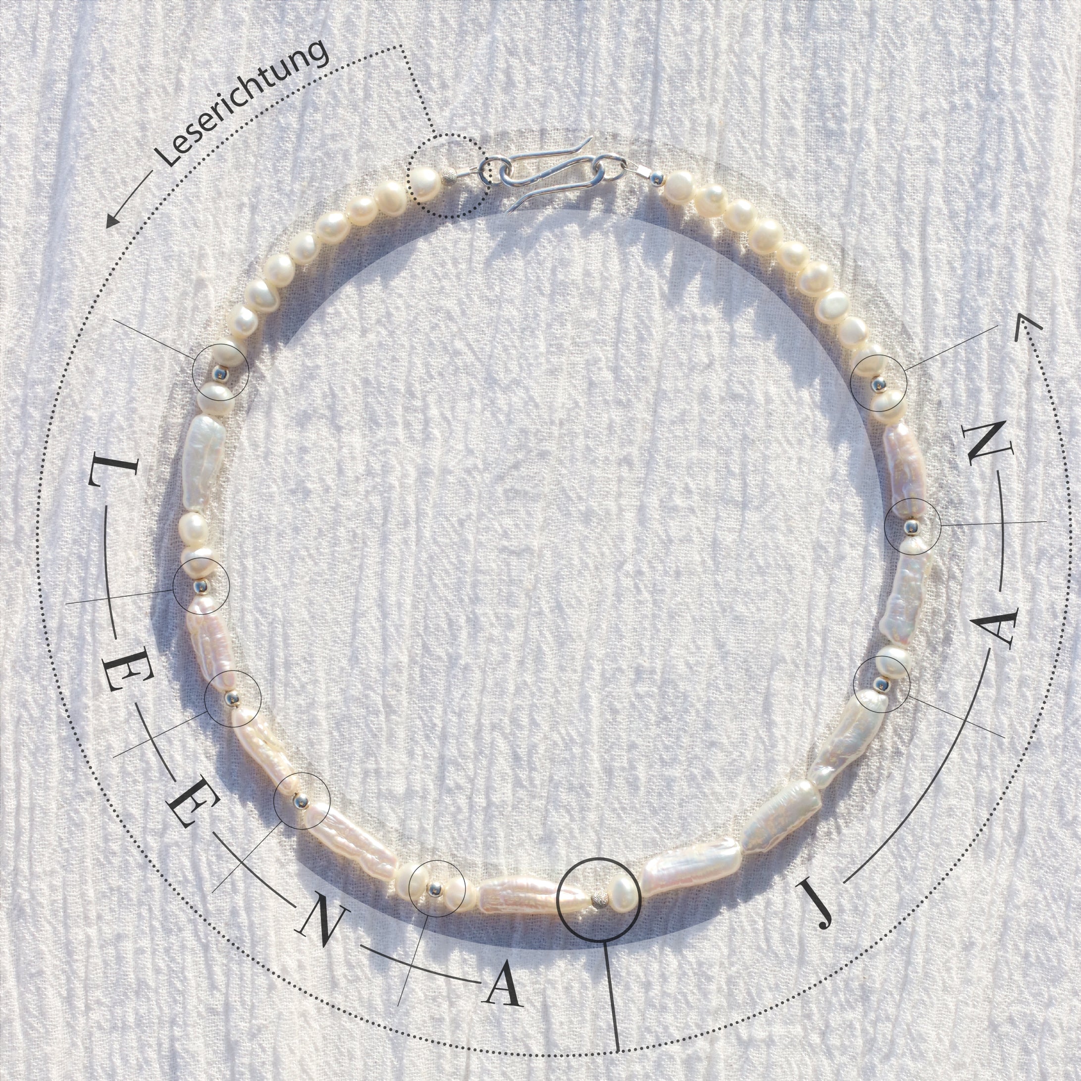 Erstelle Deine individuelle Perlenkette mit verschlüsselter Botschaft! Wir übersetzen Deinen Namen, Deine persönliche Geburtszahl und/oder die Namen Deiner Herzensmenschen ins Morsealphabet und verewigen sie mithilfe von echten Perlen unterschiedlicher Länge in einer klassisch anmutenden Perlenkette mit Geheimbotschaft.