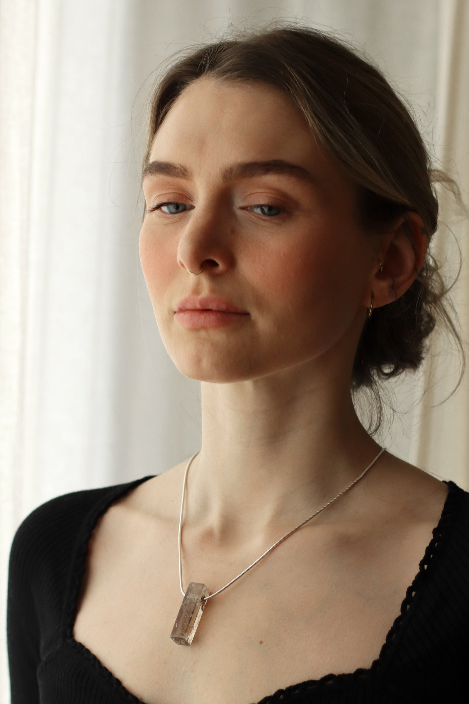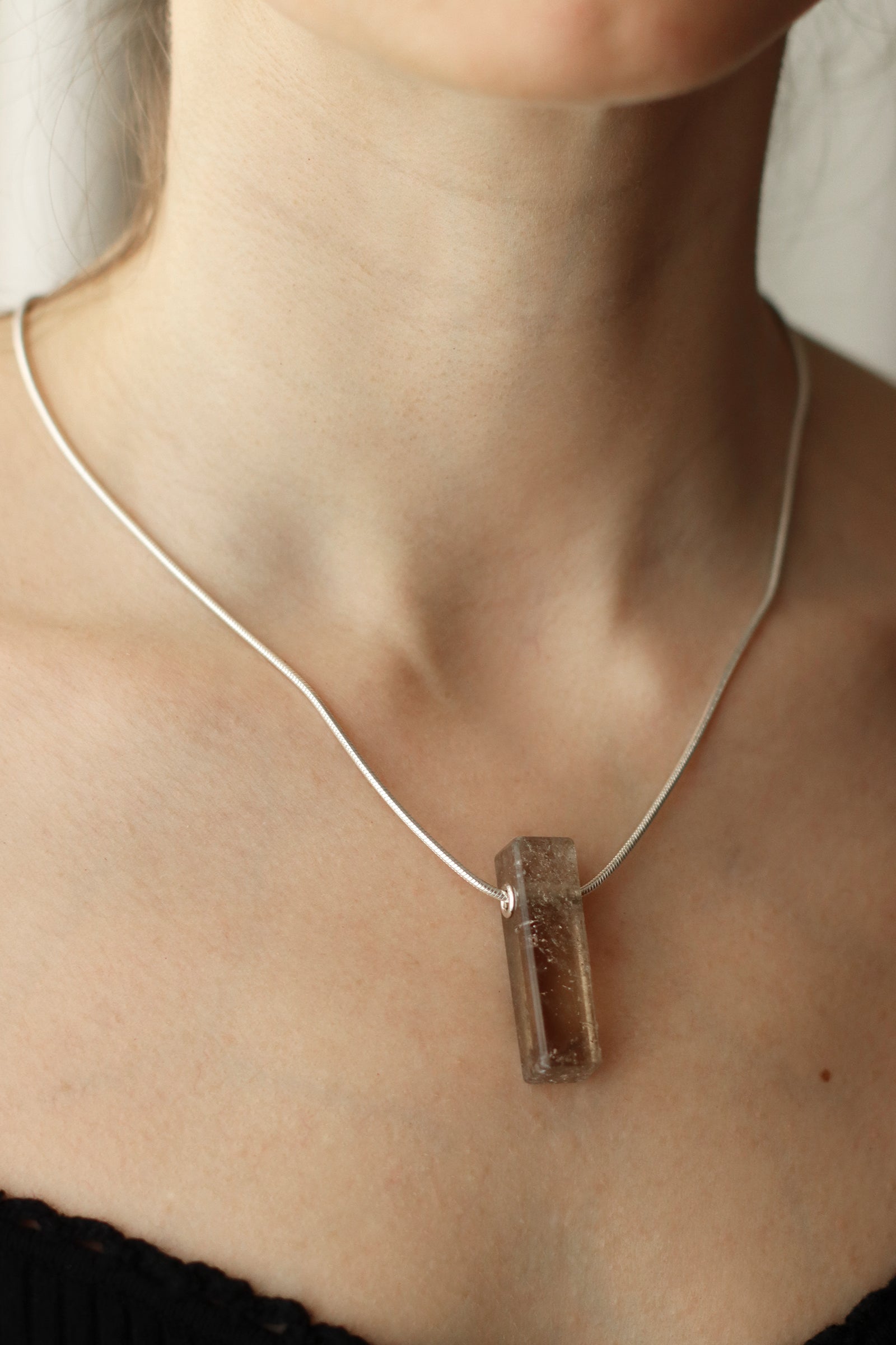 Ein Anhänger aus geschliffenem und poliertem Rauchquarz in länglicher Quaderform – auf Wunsch mit eleganter Schlangenkette in 925er Silber in unterschiedlichen Längen.