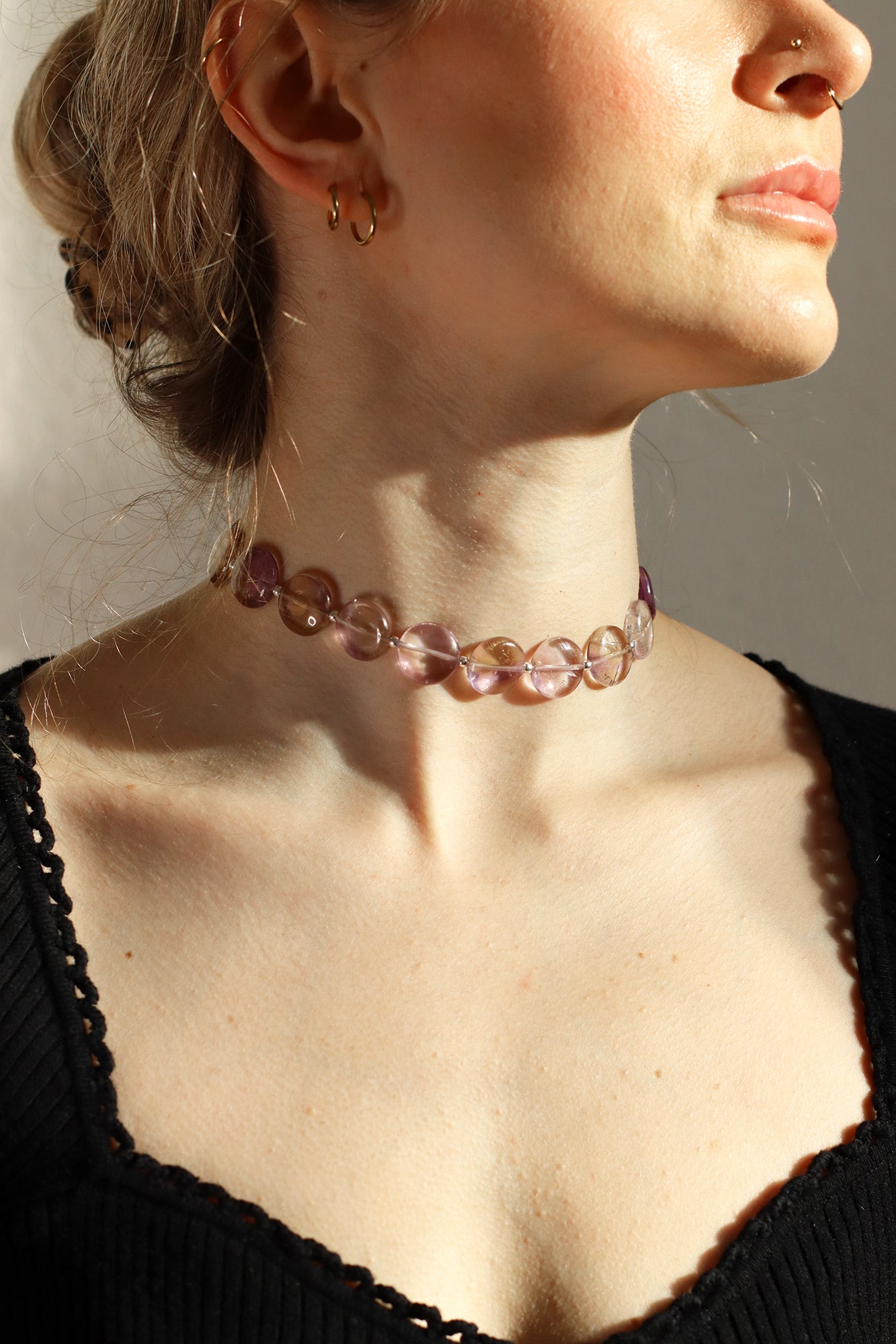 Die AURA ist verlängerbar und kann als enger Chocker in der Halsmitte oder als anschmiegsames Collier an der Halsbasis getragen werden.